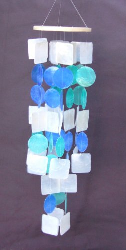 Beautiful blue green and white colored capiz wind chime.New.Ths capiz shells are tied on the top and the bottom to minimize tangling in the wind.Top is made of wood.27" long. Beautiful blue green and white colored capiz wind chime. Capiz is the outer shell of a Windowpane Oyster. It is a thin translucent shell which makes a beautiful full sound. Top is made of wood and is 27" long. Ths capiz shells are tied on the top and the bottom to minimize tangling in the wind.